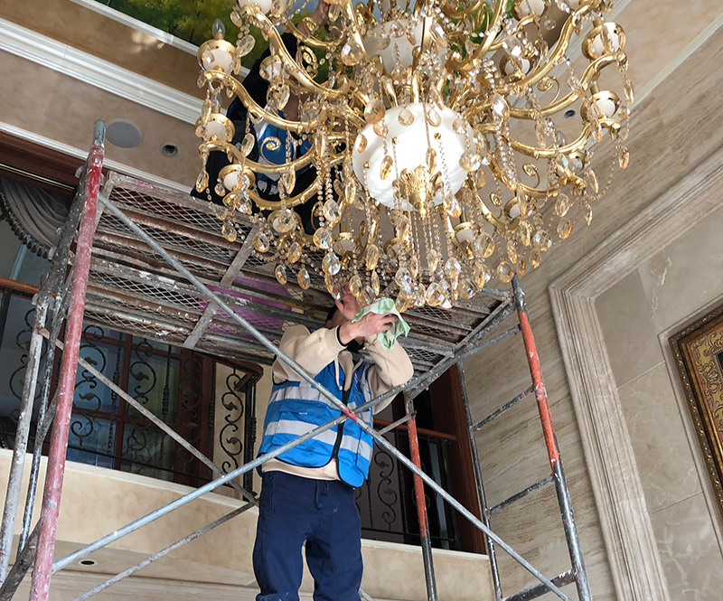 2.清洁水晶灯时要做好安全保护。吊灯的位置通常很高,如果不能拆卸下来,就要竖起架子进行登高清洗,必须保证员工的安全。